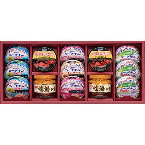 セット内容 : シーチキンマイルド(キャノーラオイル・オイル不使用)(各70g)×各3、シーチキンLフレークコラーゲン入り(70g)・紅ずわいがにブレンドほぐし身(55g)・焼鮭ほぐし(50g)×各2、シーチキンLフレークGABA入り(70g)×1