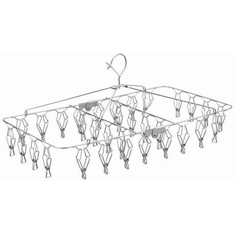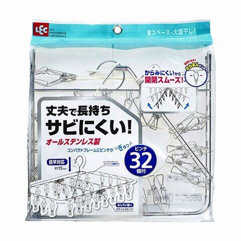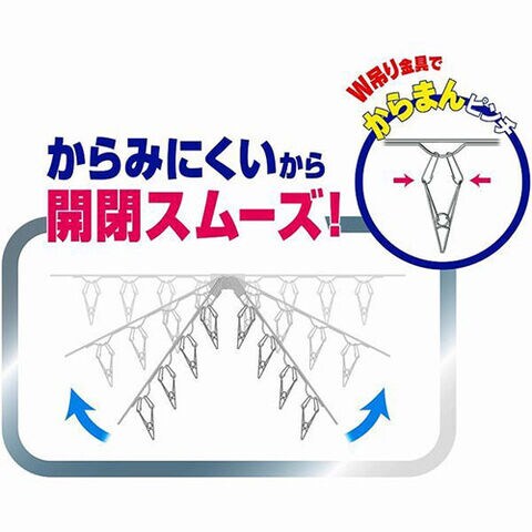 ○ピンチ32個付き。○フック部には竿用ストッパーが付いています。○ねじれにつよいステンレス製ヒンジ。○ピンチがからみにくいW吊り金具。○竿まで約15cmの低竿対応。