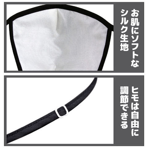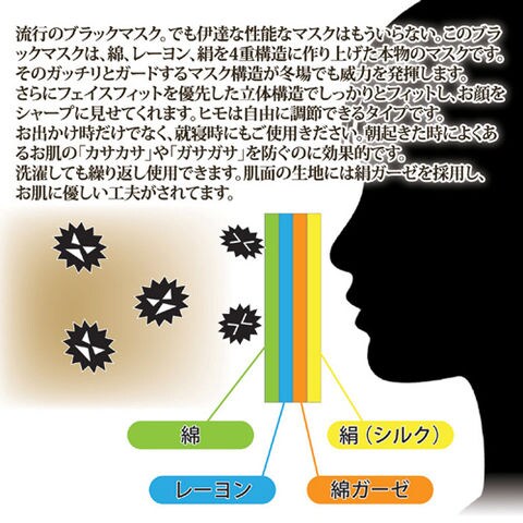 流行のブラックマスク。でも伊達な性能なマスクはもういらない。このブラックマスクは、綿、レーヨン、絹を4重構造に作り上げた本物のマスクです。そのガッチリとガードするマスク構造が冬場でも威力を発揮します。さらにフェイスフィットを優先した立体構造でしっかりとフィットし、お顔をシャープに見せてくれます。ヒモは自由に調節できるタイプです。お出かけ時だけでなく、就寝時にもご使用きださい。朝起きた時によくあるお肌の「カサカサ」や「ガサガサ」を防ぐのに効果的です。洗濯しても繰り返し使用できます。肌面の生地には絹ガーゼを採用し、お肌に優しい工夫がされてます。※手洗い可能(タンブラー乾燥はお避けください)