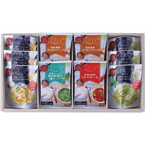 セット内容 : 粉末パスタソース(ジェノベーゼ・ペペロンチーノ)×各3、オニオンスープ×2、ミネストローネ・緑色野菜の塩スープ×各1