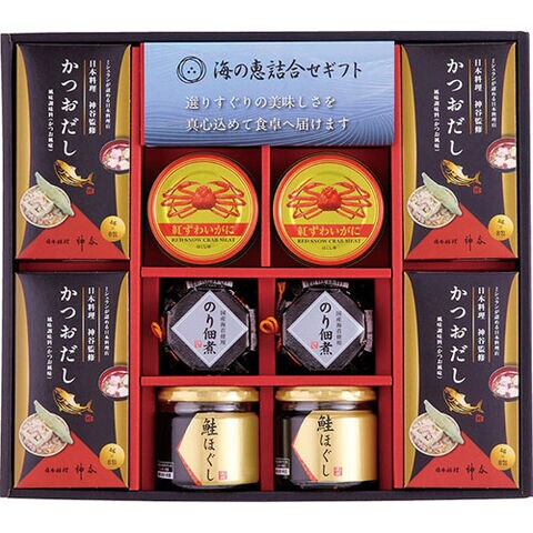 海の恵詰合せ 日本料理神谷監修かつおだし(4g×8袋)×4、のり佃煮(80g)・紅ずわいがにほぐし身(55g)・鮭ほぐし(50g)×各2 L9067567