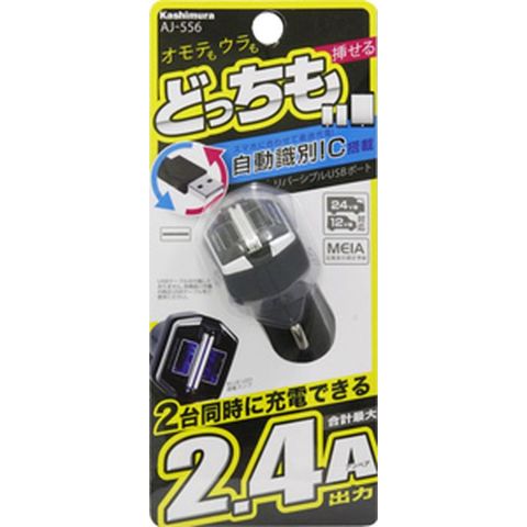 DCソケット 2.4A リバーシブル USB 2ポート 自動判定 ブラック カシムラ AJ-556
