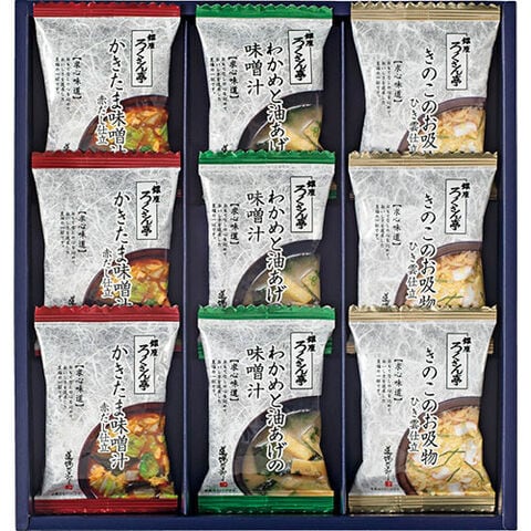セット内容 : きのこのお吸物ひき雲仕立・わかめと油あげの味噌汁・かきたま味噌汁赤だし仕立×各3