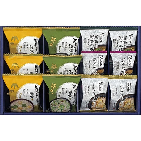 セット内容 : 貝柱と三つ葉の雑炊・とりわさ風雑炊×各3、ふかひれスープ・昆布と野菜の味噌汁・茄子の味噌汁×各2
