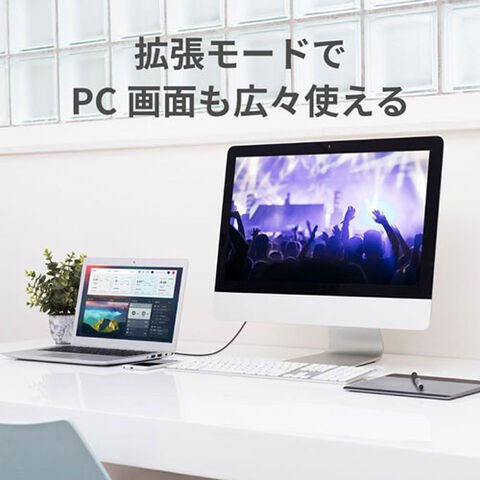USB Type-Cポートを使用するため、スマートフォンの他、HDMIポートが少ないノートPCでも手軽にマルチディスプレイ化が可能です。4K60Hz出力にも対応しており、ミラーリング/拡張どちらかを選んで使用することができます。
