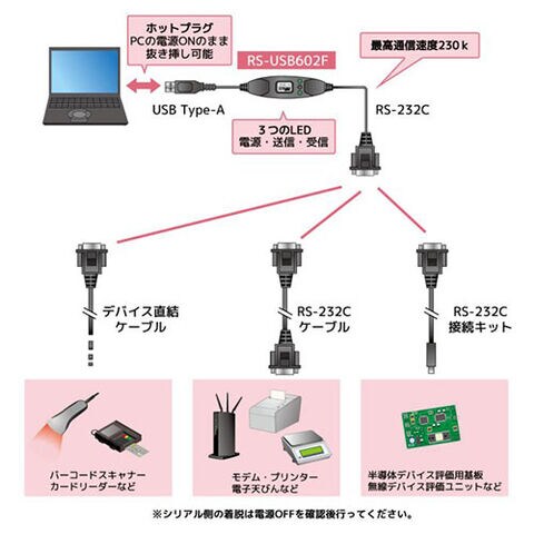 パソコンのUSBポート(Type-A)にRS-232C機器を接続