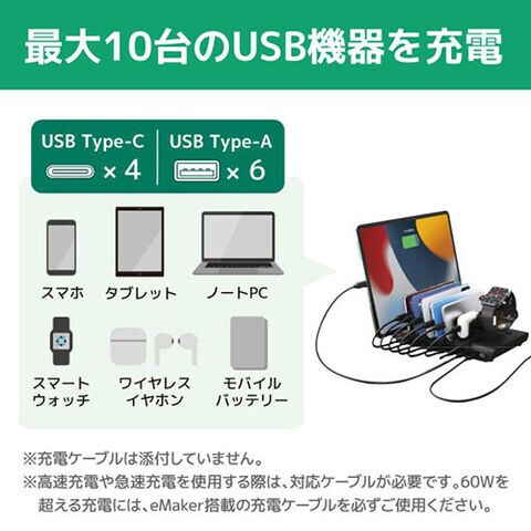 ※高速充電や急速充電をご使用になるには、充電する機器に適合した充電ケーブルが必要です。USB-Cポートで60Wを超える充電には、eMaker搭載の充電ケーブルを必ずご使用ください。