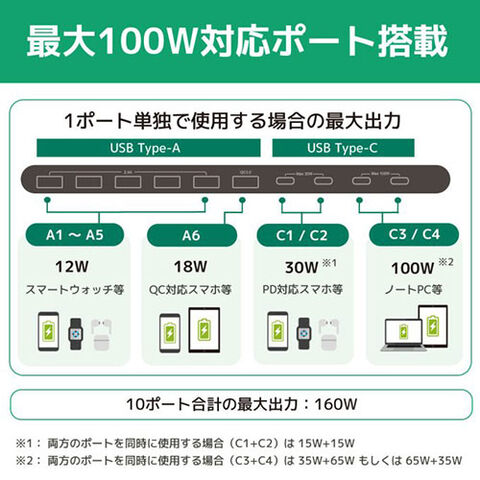 ●10ポート合計で最大160W、1ポートあたり最大100Wに対応