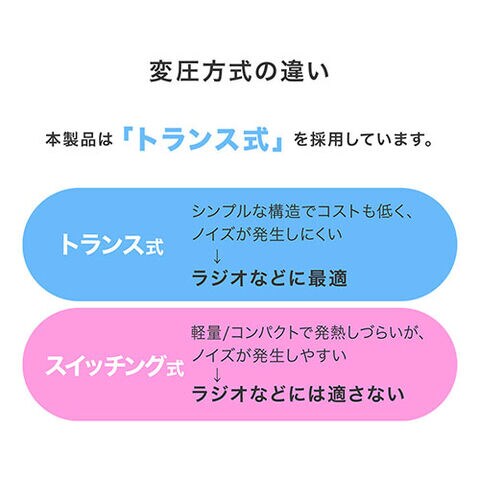 ● トランス方式採用で電源ノイズが少なく、ラジオなどの外部電源に最適