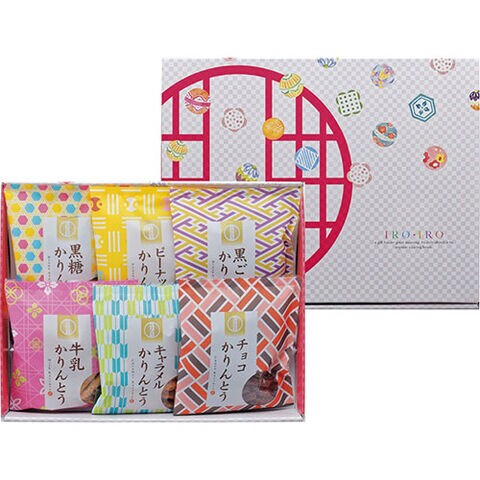 サクサクッとした食感に仕上げた、風味豊かなハチミツ入り黒糖かりんとう、ピーナッツの香ばしさと甘みが調和した、風味豊かなピーナツかりんとう、牛乳を生地に練り込み、サクサクッとした食感に仕上げた牛乳かりんとう、香ばしい黒ごまで仕上げ風味豊かな黒ごまかりんとう、チョコレートを生地にたっぷりと練り込み、カリッとかる~い食感に仕上げたチョコかりんとう、キャラメルを生地にたっぷりと掛け、しっとりと仕上げたキャラメルかりんとう。6種類のフレーバーを楽しめるかりんとう詰め合わせです。