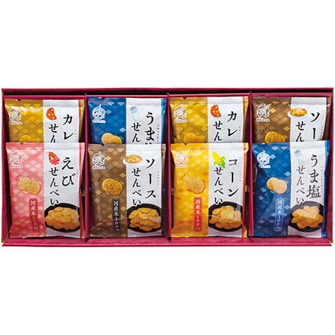 国産米を100%使用しカリッと口いっぱいに広がる香ばしいえびの風味で後引く旨さのえびせんべい、スイートコーンの甘さが引き立つ、香ばし醤油仕立てのコーンせんべい、せんべいの生地にあおさ海苔を練り込み磯の香り、ソースの旨み、酸味、懐かしさを堪能できる味に仕上げたソースせんべい、カリッと、シンプルな美味しさでお米を味わうあっさりうま塩せんべい、スパイシーなカレー風味で お米とカレーのゴールデンコンビのカレーせんべいをセットした米菓詰合せです。
