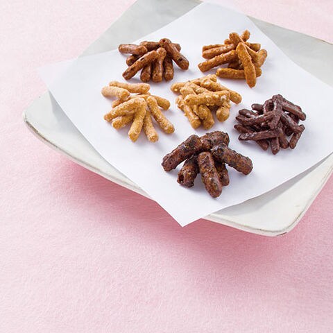 サクサクッとした食感に仕上げた、風味豊かなハチミツ入り黒糖かりんとう、ピーナッツの香ばしさと甘みが調和した、風味豊かなピーナツかりんとう、牛乳を生地に練り込み、サクサクッとした食感に仕上げた牛乳かりんとう、香ばしい黒ごまで仕上げ風味豊かな黒ごまかりんとう、チョコレートを生地にたっぷりと練り込み、カリッとかる~い食感に仕上げたチョコかりんとう、キャラメルを生地にたっぷりと掛け、しっとりと仕上げたキャラメルかりんとう。6種類のフレーバーを楽しめるかりんとう詰め合わせです。