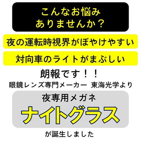 こんなお悩みありませんか? そんな方に朗報です!! 眼鏡レンズ専門メーカー、東海光学より、夜専用メガネ『ナイトグラス』が誕生しました。メガネ型のスマートタイプです。