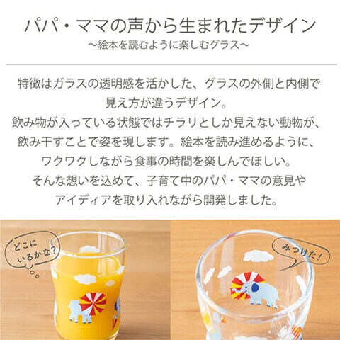 「パパ・ママの声から生まれたデザイン」特徴はガラスの透明感を活かした、グラスの外側と内側で見え方が違うデザイン。