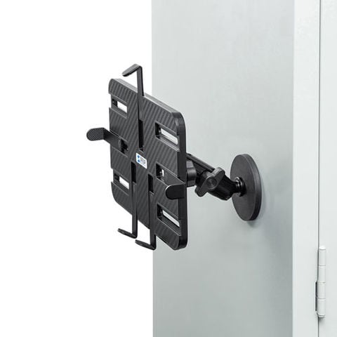 工事車両やスチール製ラックなどに取り付けできる強力マグネット式タブレットホルダー。2関節タイプ。