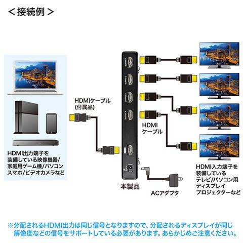 ※分配されるHDMI出力は同じ信号となりますので、分配されるディスプレイが同じ解像度などの信号をサポートしている必要があります。あらかじめご注意ください。
