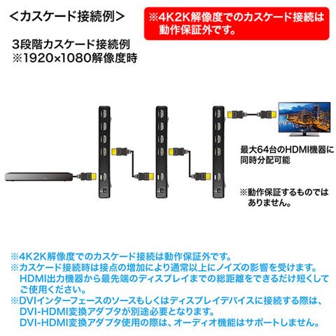 ※カスケード接続時は接点の増加により通常以上にノイズの影響を受けます。HDMI出力機器から最先端のディスプレイまでの総距離をできるだけ短くしてご使用ください。