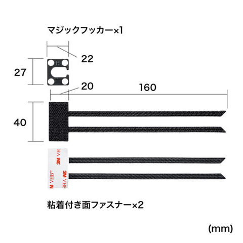 ■セット内容:面ファスナー(ポリエステル・難燃タイプ(黒))×2枚、マジックフッカー(ポリカーボネート(黒))×1枚