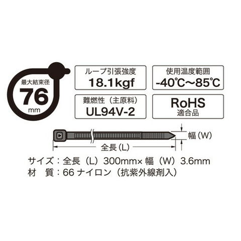 オーム電機 OHM ロックタイ 300mm 耐候 黒 10本入り LT-300W10BK
