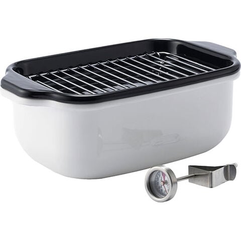小さめでコンパクトなのに長い食材も調理でき効率的。バットとスノコ、防水温度計付き。ほうろう用鋼板にガラス質を焼き付けたホーローは酸や塩分に強く、匂いや汚れもつきにくく洗えばスッキリ落とせ、いつまでも光沢を保ちます。本体、バットはオーブン調理もOK。200VIH対応可能。