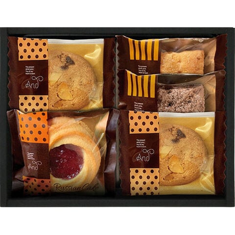 セット内容 : ナッツとチョコのざっくりクッキー×2、ロシアケーキ(ブルーベリーサン)・スクエアパイ(プレーン・ショコラ)×各1