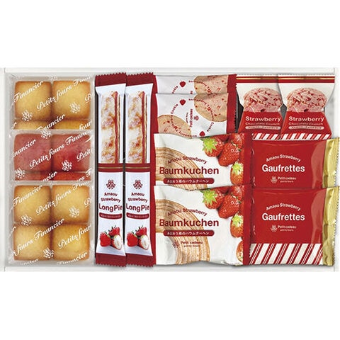 セット内容 : あまおう苺バウムクーヘン・あまおう苺ロングスティックパイ・あまおう苺ゴーフレット・焼きほろろイチゴクッキー・ストロベリーチョコクランチ・プチフィナンシェ(プレーン)(4個入)×各2、プチフィナンシェ(あまおう苺)(4個入)×1