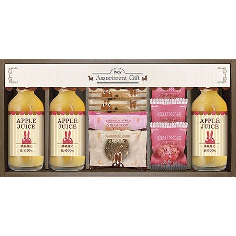セット内容 : チョコクランチ(ストロベリー)・アップルジュース(180ml)×各3、ナッツとチョコのざっくりクッキー×2、焼きほろろクッキー(ココア・ストロベリー)×各1