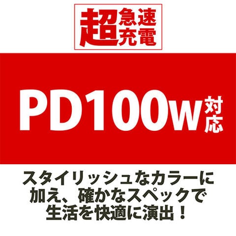 ●充電速度 : 最大PD100Wでの充電に対応 *別途対応したAC充電器やモバイルバッテリー等が必要となり、出力W数は機器によって異なります。