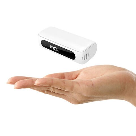 従来品の半分のコンパクトサイズ、軽量、本体残量が一目でわかる「%」表示、急速充電・2台同時充電可能。