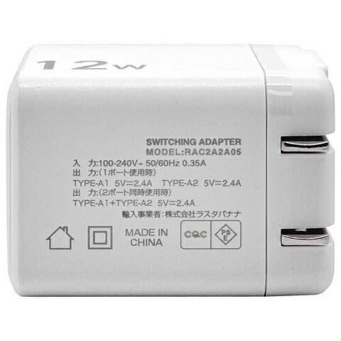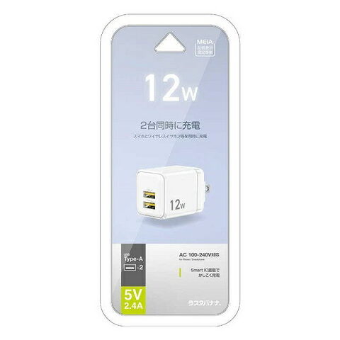 充電器 ACアダプター USB充電器 タイプA 2ポート 5V 2.4A 12W コンセント AC USB Type-A 2台同時 小型 コンパクト 持ち運び smart IC ホワイト ラスタバナナ RAC2A2A05WH