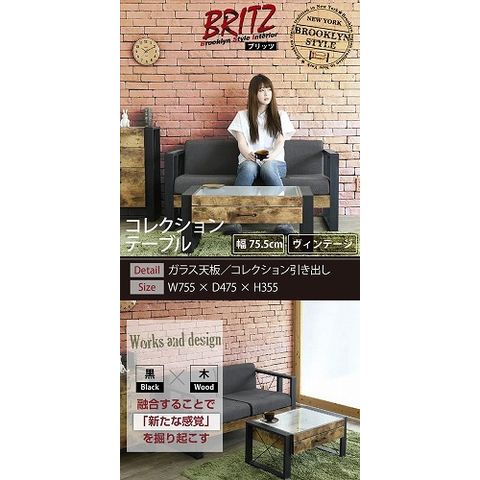 ブルックリンスタイル コレクション センターテーブル 幅75 奥行48 高さ35 引き出し ガラス テーブル ローテーブル リビング 【ブラック×ブラウン】