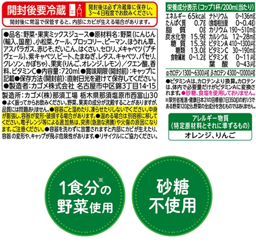 1食分の野菜(200ml当たり)を使用し、オレンジやリンゴのフルーティーな味わいを楽しみながらビタミンAとビタミンCがたっぷり摂れるので、家族みんながおいしく手軽に野菜を補える野菜飲料です。