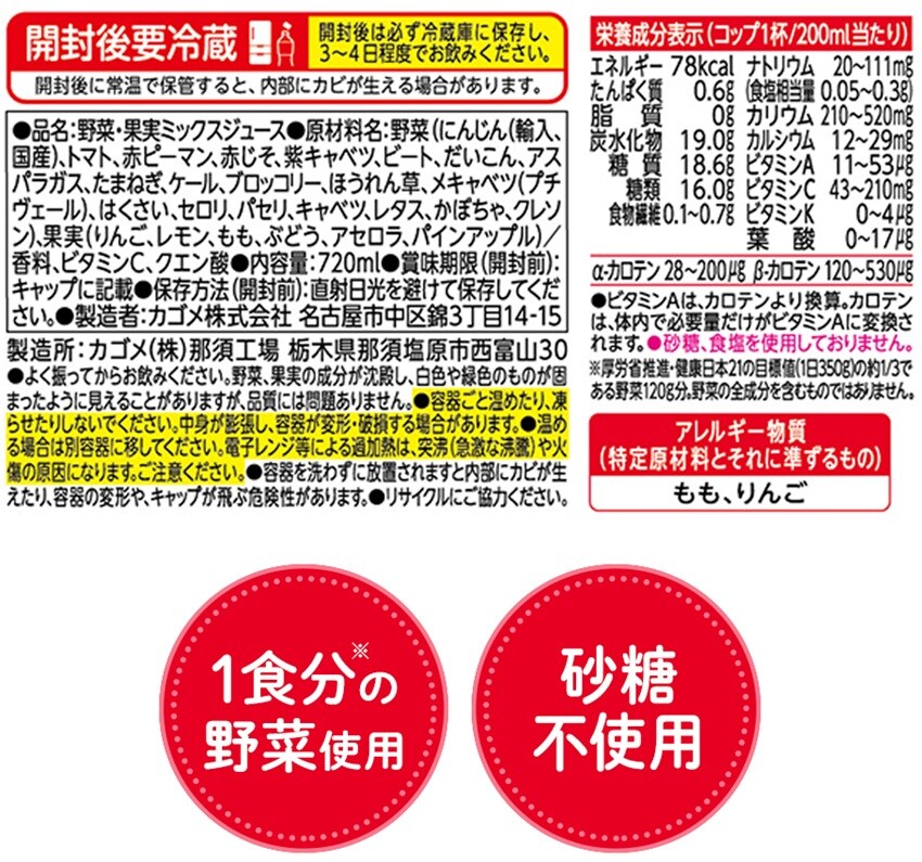 1食分の野菜を使用(200ml当たり)し、りんごの蜜感のある甘みと香りを楽しみながらたっぷりビタミンCとしっかりカルシウムが摂れるので、家族みんながおいしく手軽に野菜を補える野菜飲料です。