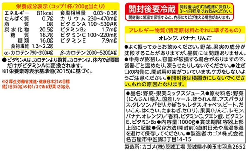 〇野菜飲料は原料野菜の全成分を含むものではありませんが、不足しがちな野菜を補うためにお役立てください。