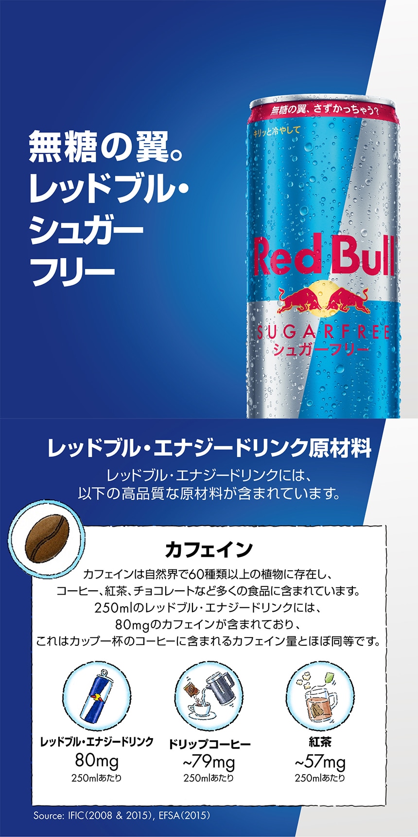 無糖の翼、さずかっちゃう?レッドブル・エナジードリンクは、あなたが必要なときに翼をさずけます。仕事中、スポーツ中、勉強中、ゲームをしてる時や、遊ぶときにも。あなたがアクティブなライフスタイルを実現したいときの理想な相棒です。