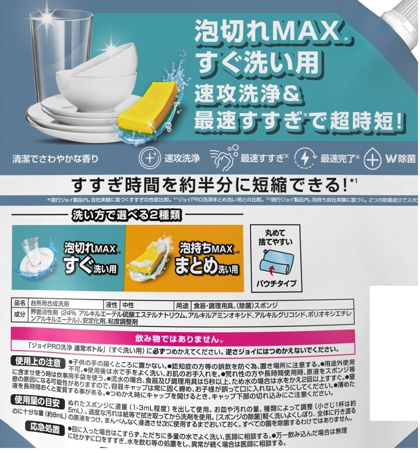 ※1…現行ジョイ製品内。自社実験に基づくすすぎの性能比較。2つの除菌成分でスポンジ除菌
