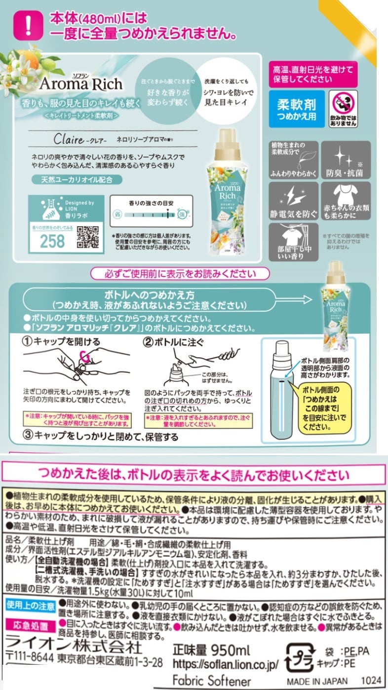【A】(送料込)ライオン ソフラン 柔軟剤 アロマリッチ クレア つめかえ 特大 950ml×6個《沖縄・離島配送不可》