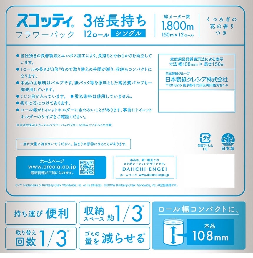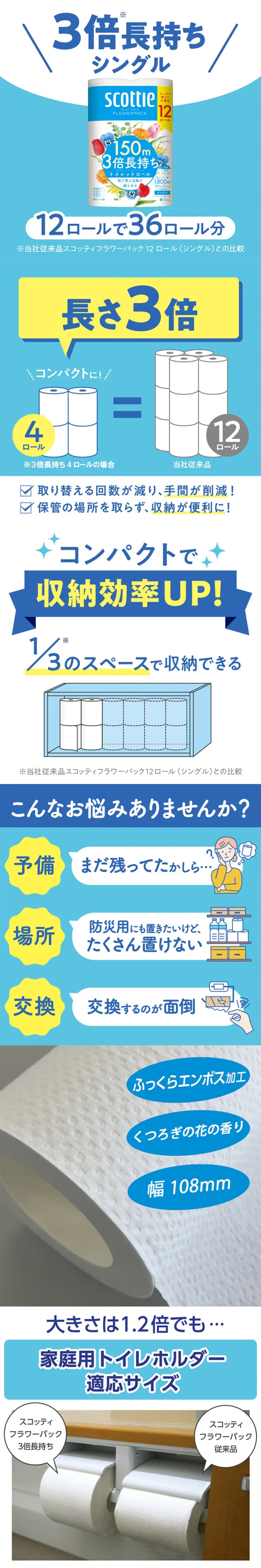 ●1ロールの長さが3倍だから、12ロールで36ロール分の長さ(スコッティフラワーパック12ロール比)。