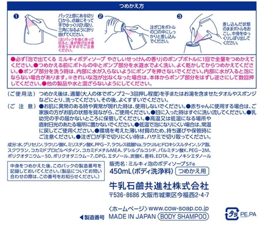 【A】(送料込)牛乳石鹸 COW 泡で出てくるミルキィボディソープ やさしいせっけんの香り つめかえ 450ml×16個《沖縄・離島配送不可》