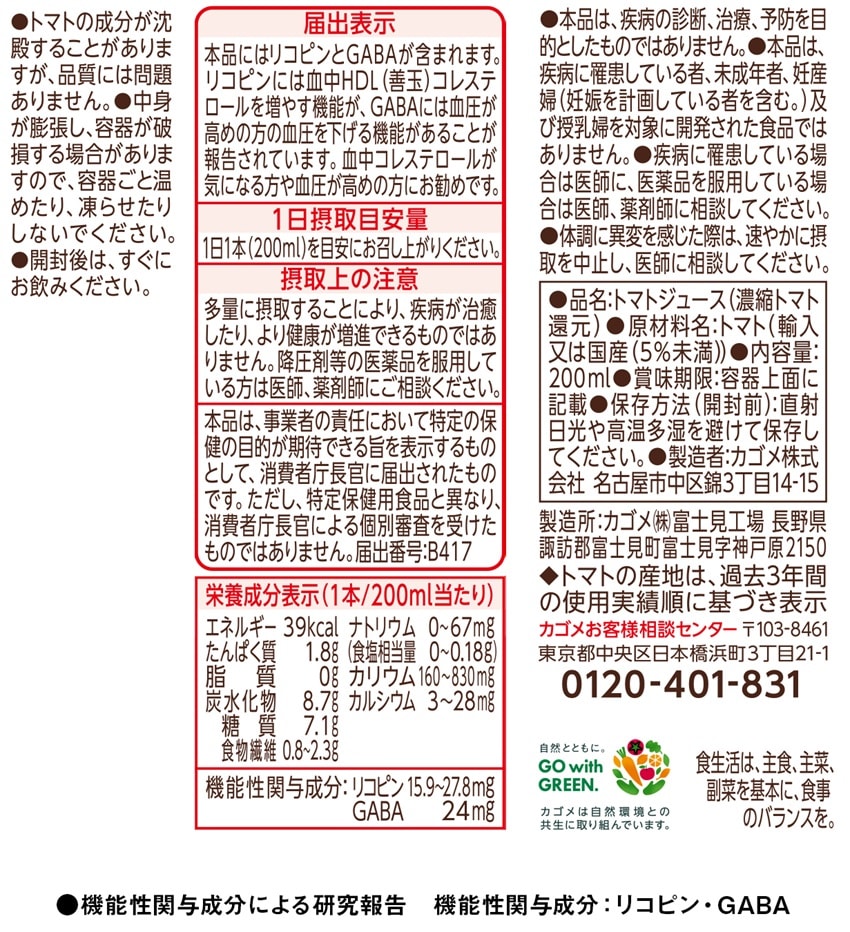 リコピンには血中HDL(善玉)コレステロールを増やす機能が、GABAには高めの血圧を下げる機能があることが報告されています。