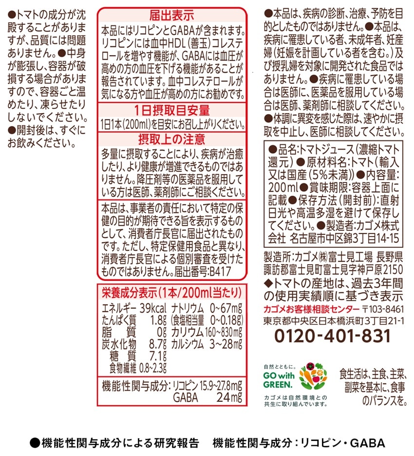 リコピンには血中HDL(善玉)コレステロールを増やす機能が、GABAには高めの血圧を下げる機能があることが報告されています。