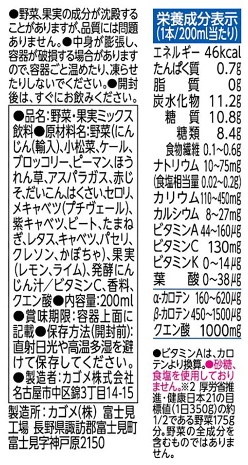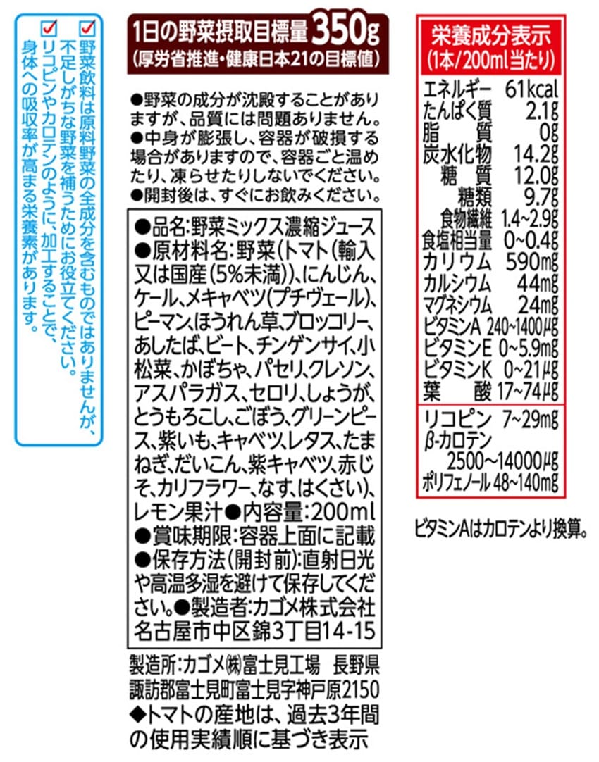 ※1:野菜飲料は原料野菜の全成分を含むものではありませんが、不足しがちな野菜を補うためにお役立てください。