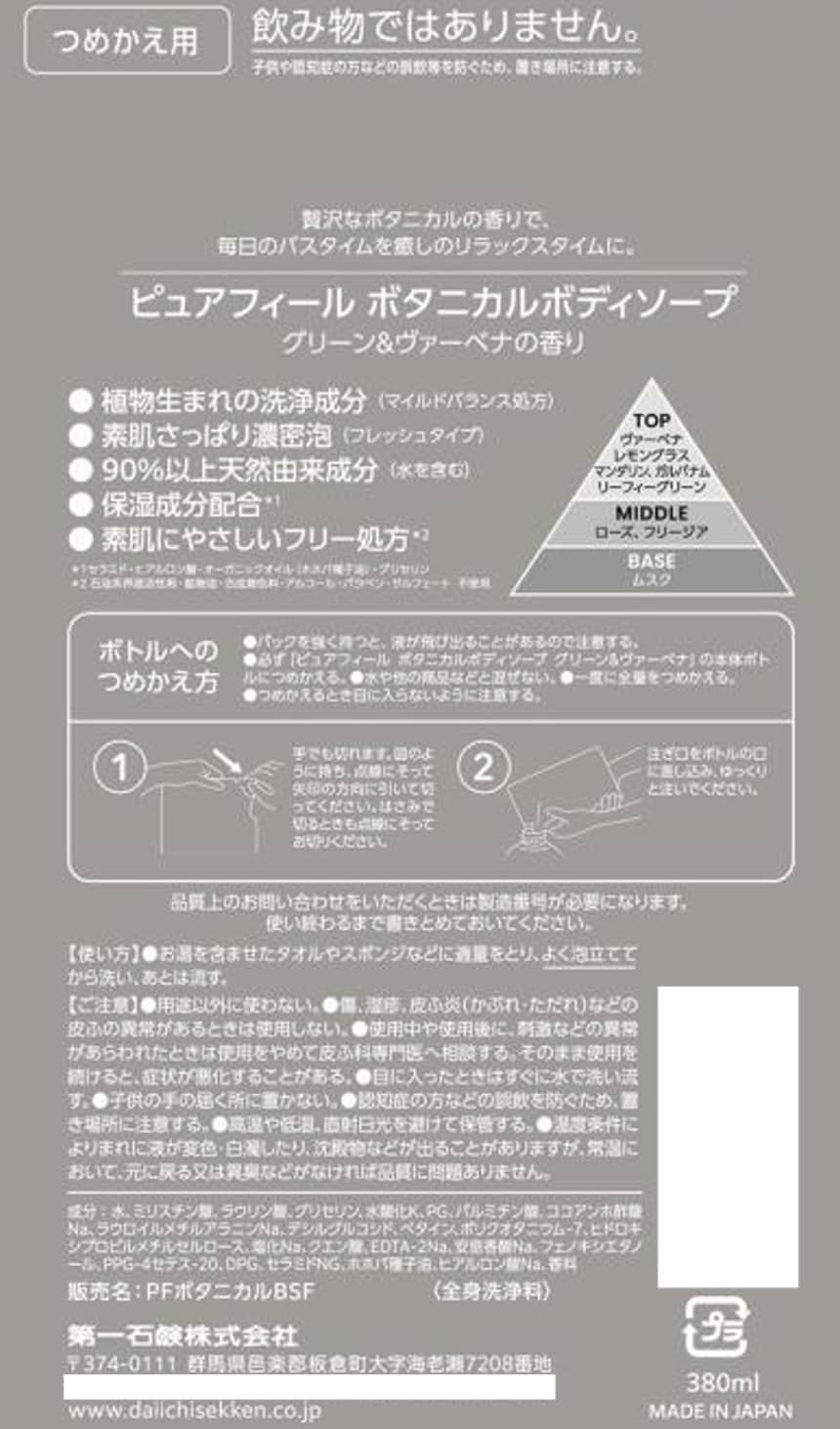 【A】(送料込)ピュアフィール ボタニカルボディーソープ グリーン&ヴァーベナ 詰替 380ml×20個《沖縄・離島配送不可》