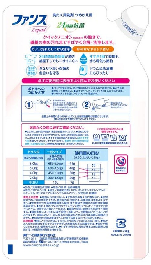 【A】(送料込)ファンス 衣料用液体洗剤 詰替用 720g×12個《沖縄・離島配送不可》
