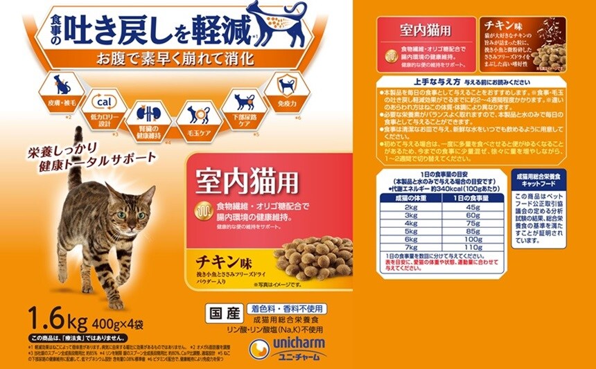独自の食物繊維配合技術で、お腹の中で粒が素早くふやけて崩れるので、ドライフードを粒のまま吐き戻す事を軽減します。