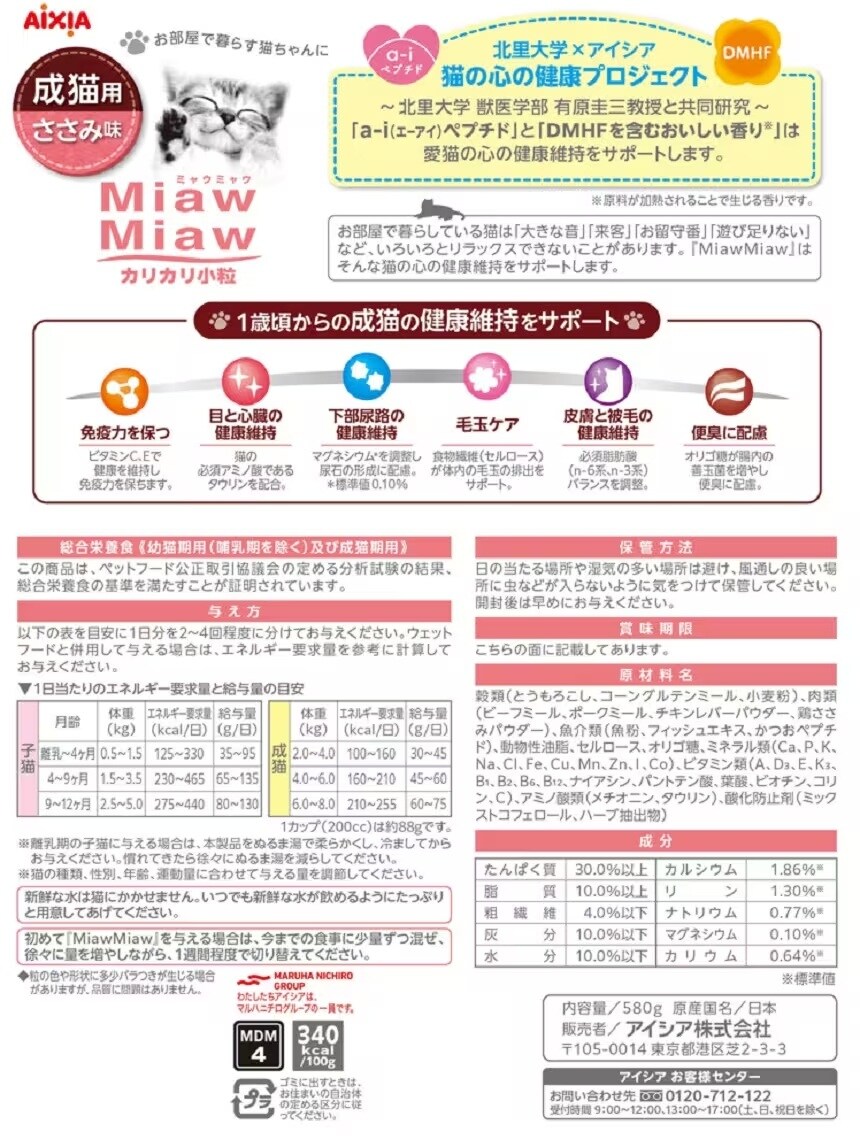 【D】(送料込)MiawMiaw カリカリ小粒 ささみ味 580g×8個《沖縄・離島配送不可》