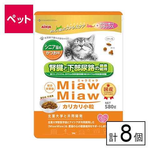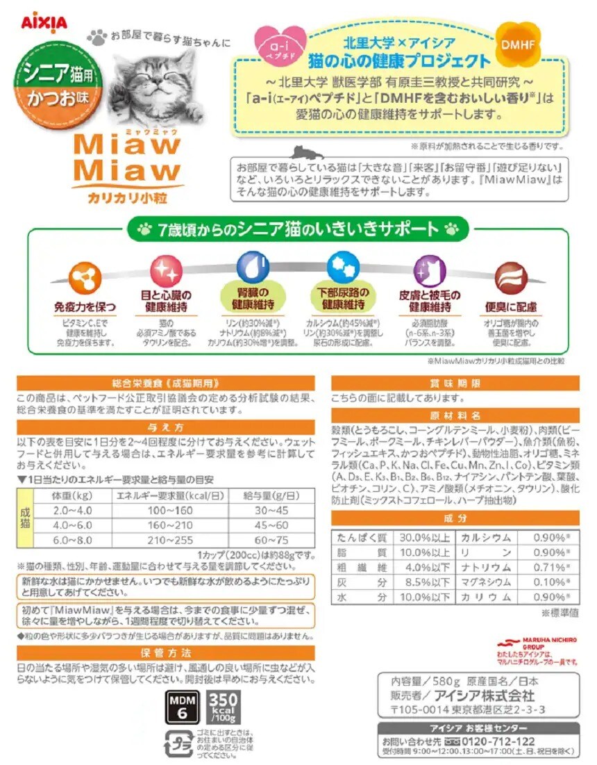【D】(送料込)MiawMiaw カリカリ小粒 シニア猫用 かつお味 580g×8個《沖縄・離島配送不可》