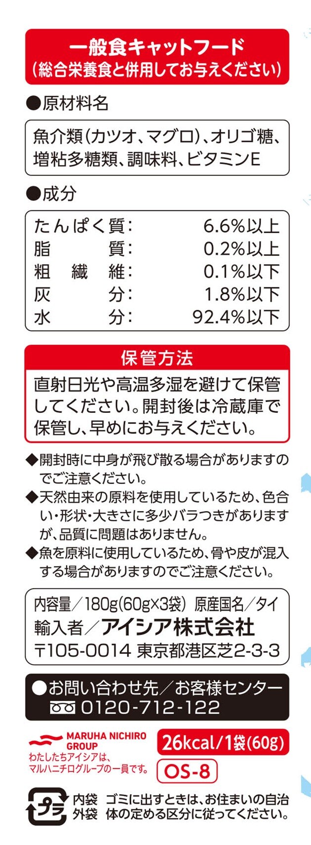 おさかなのおいしさをとじこめたゼリー仕立てで、11歳頃からのシニア猫の健康維持に配慮し、ビタミンEと腸内の善玉菌を増やすオリゴ糖を調整。