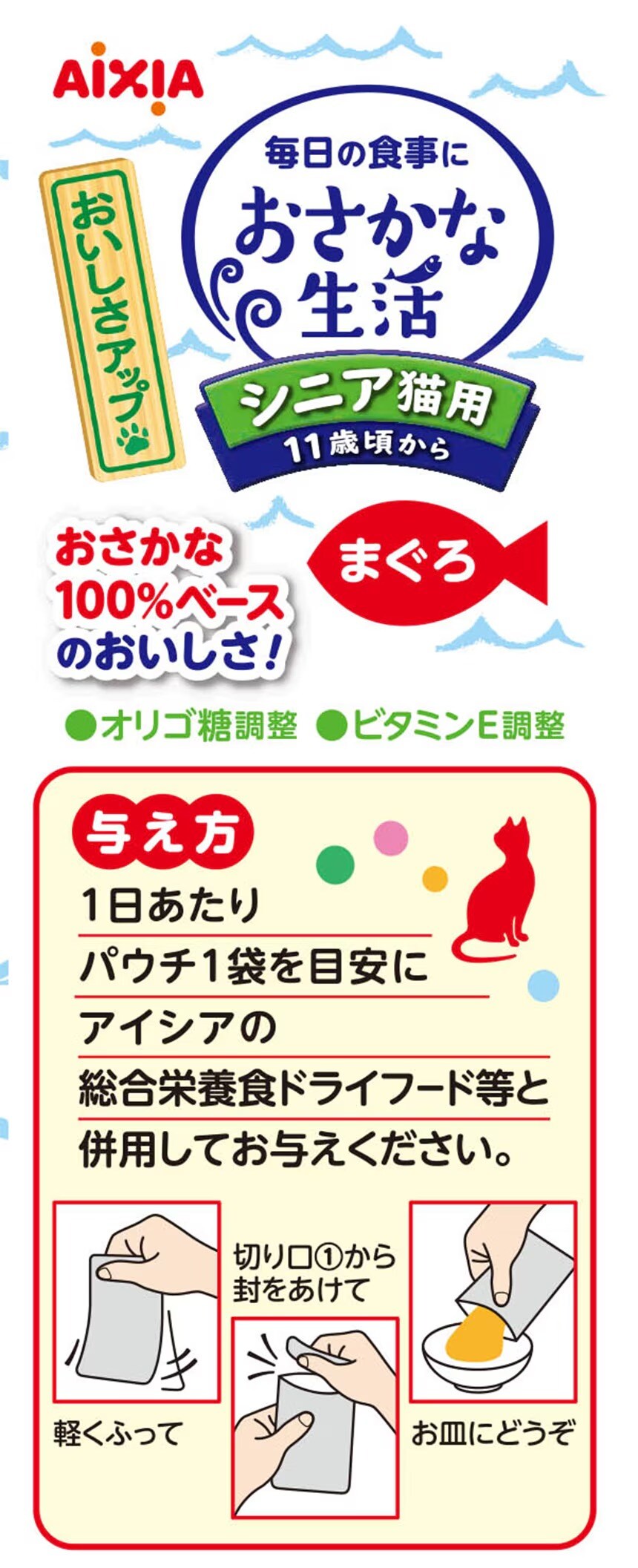 おさかなのおいしさをとじこめたゼリー仕立てで、11歳頃からのシニア猫の健康維持に配慮し、ビタミンEと腸内の善玉菌を増やすオリゴ糖を調整。