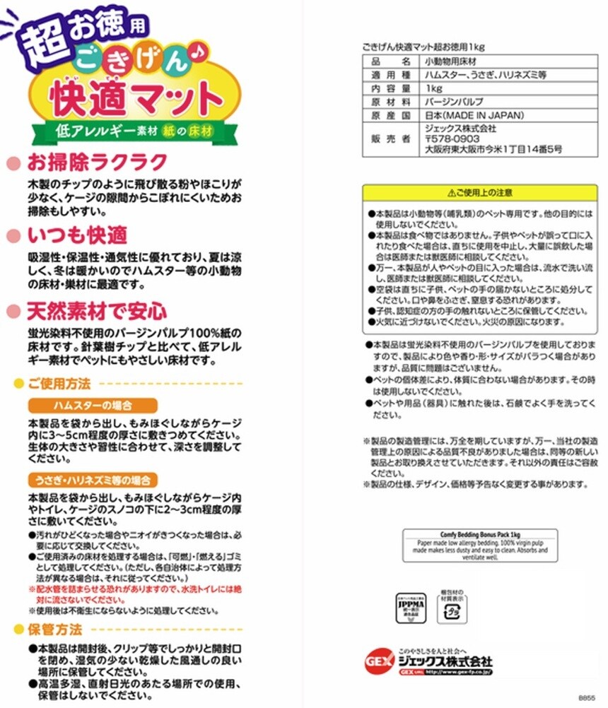 吸湿性、保湿性、通気性に優れており、夏は涼しく、冬は暖かいのでハムスター等の小動物の床材・巣材に最適です。